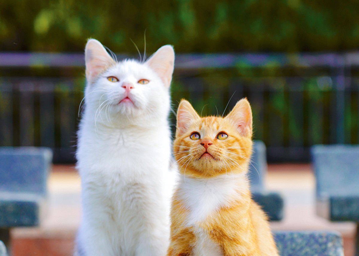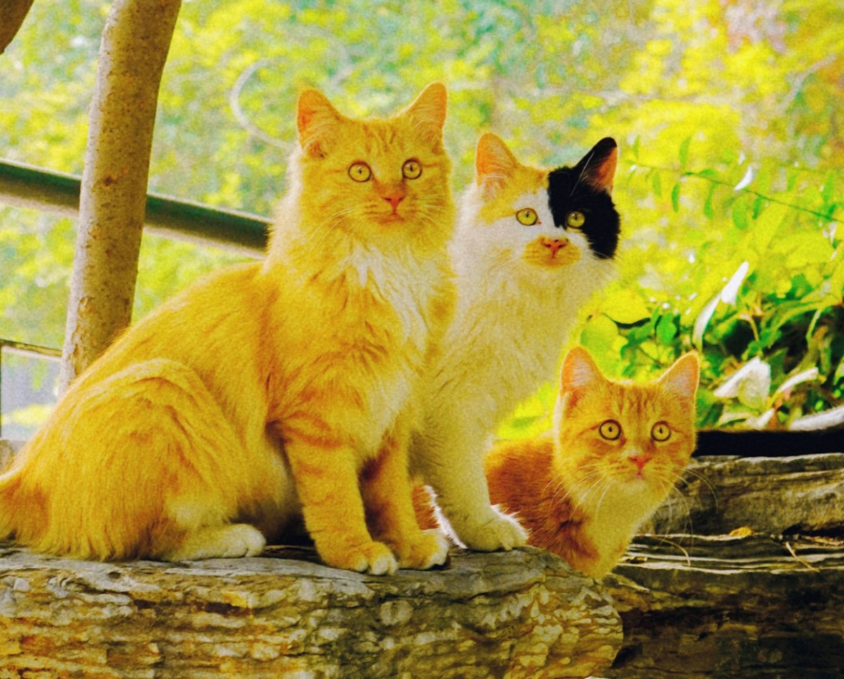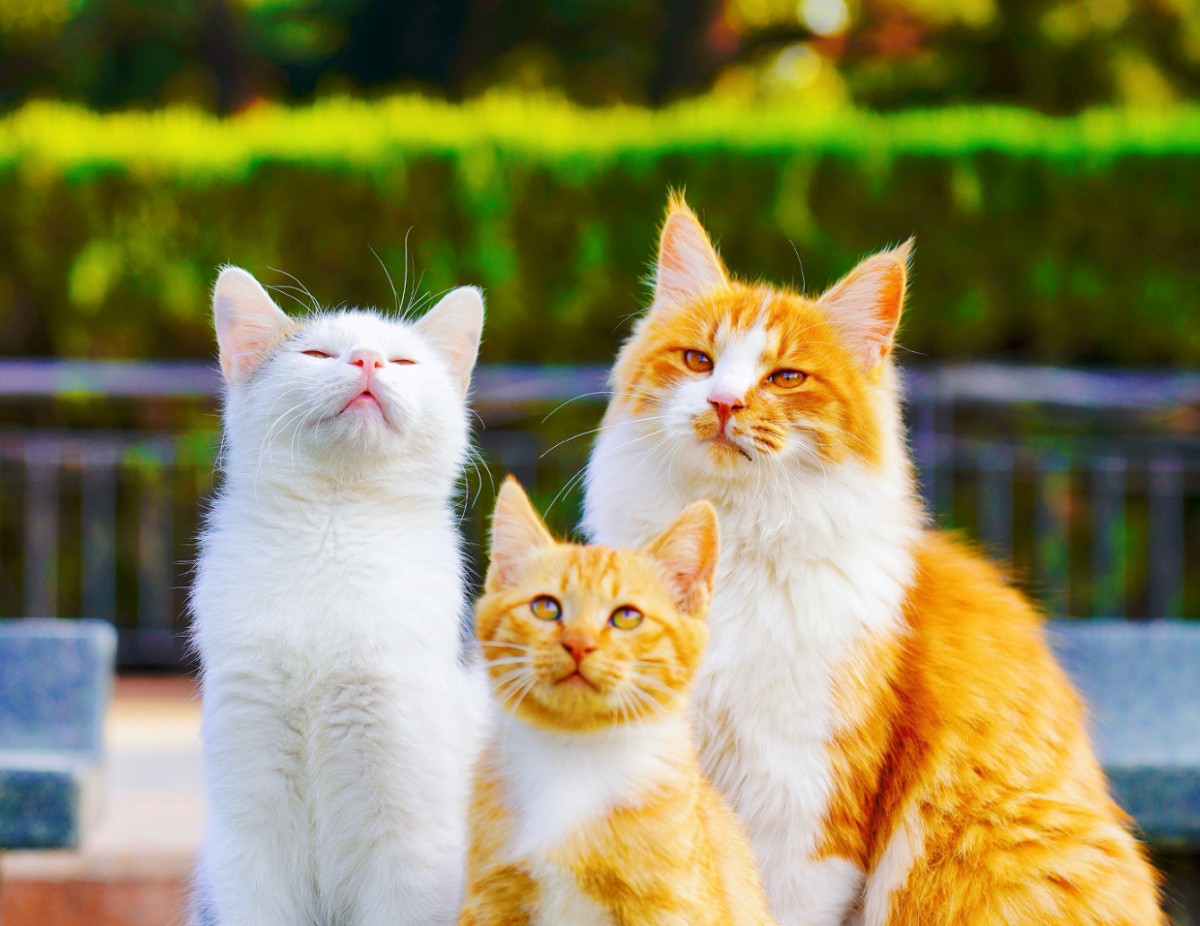 背景中的绿色植物,虽然模糊,却为整个画面增添了几分神秘与深远。它们可能是树木,也可能是灌木,但无论是什么,都仿佛在为这三只猫咪搭建一个完美的舞台,让它们尽情地展现春天的魅力。